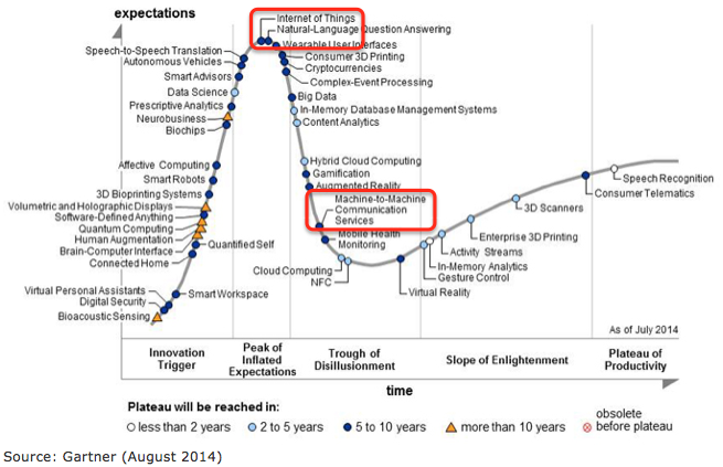 Machine-to-Machine Communication Services - note that this refer to services, not M2M [technologies] themselves, which are more in Slope of Enlightenment.